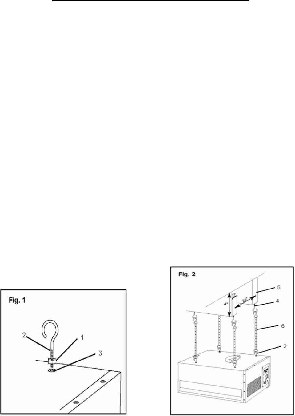 2. Thread a hanger into each of the four mounting holes (3) on the top of the air filter cabinet.