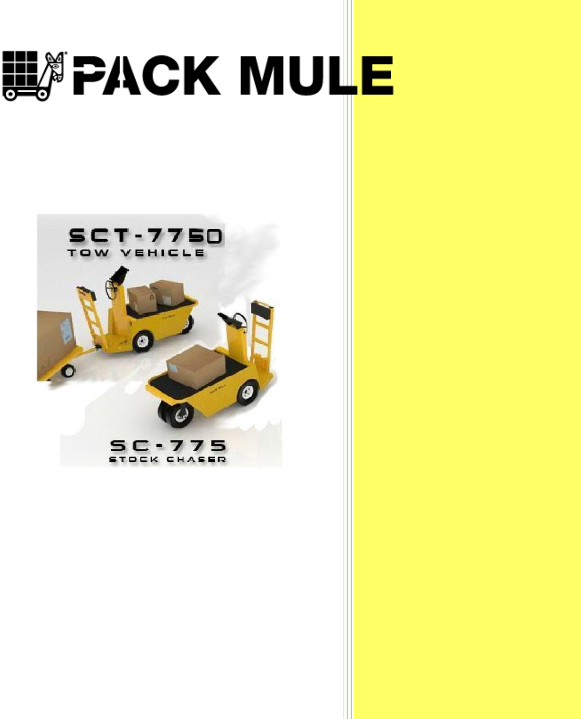 OPERATING INSTRUCTIONS D RIVING Follow these steps to operate your Pack Mule vehicle: 1) 2) 3) 4) 5) 6) 7) Disconnect the battery charger. Remove the battery charger cord from the power outlet. Perform Startup Checklist for Industrial Trucks (see next page for checklist). Ensure surrounding area is clear of all obstructions and everything properly stored and secured. Make sure you are standing on the operator platform, holding the steering wheel.