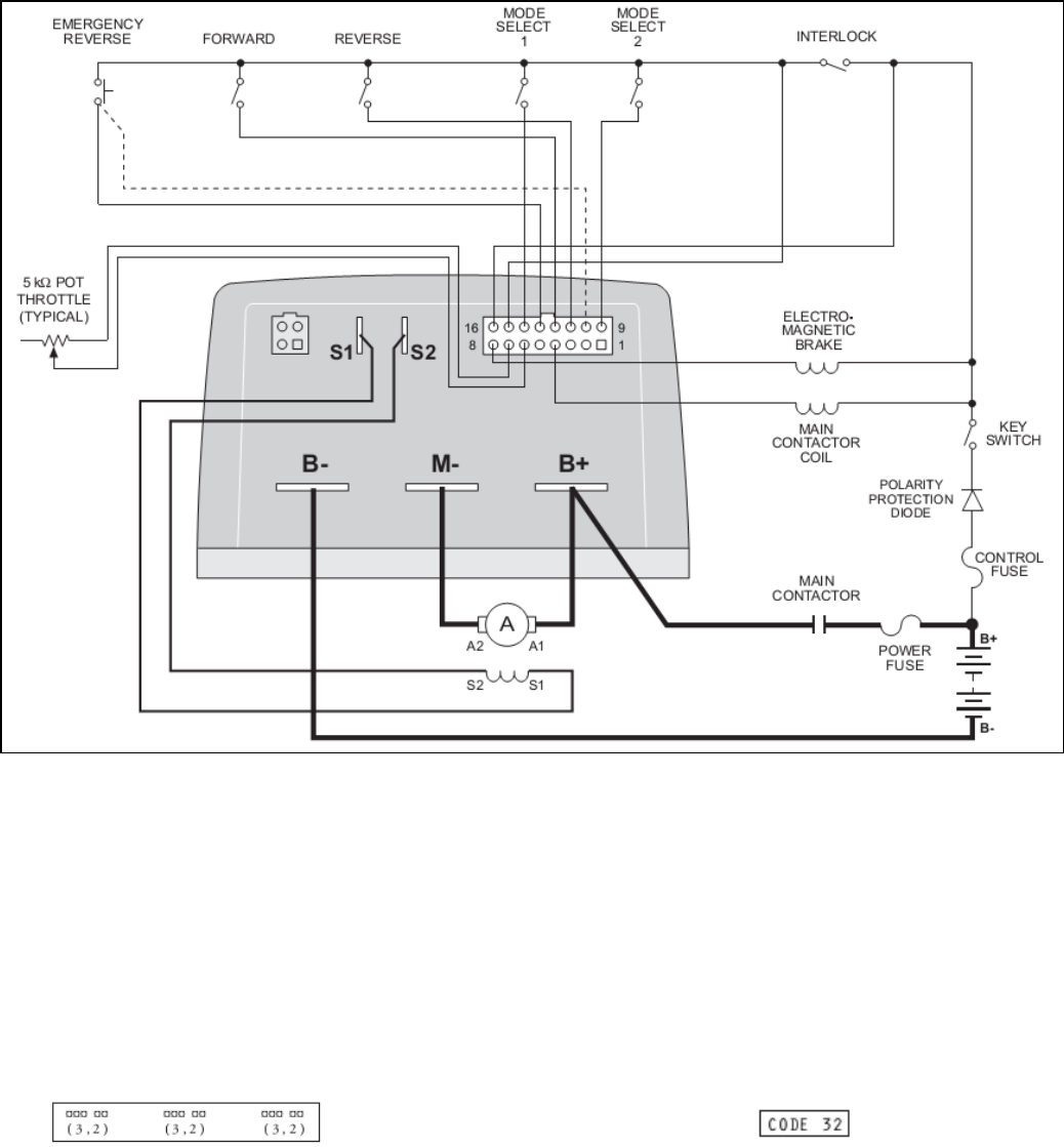 Controller Wiring: Typical Controller wiring configuration of PC series vehicles. The interlock switch is a seat switch or foot switch