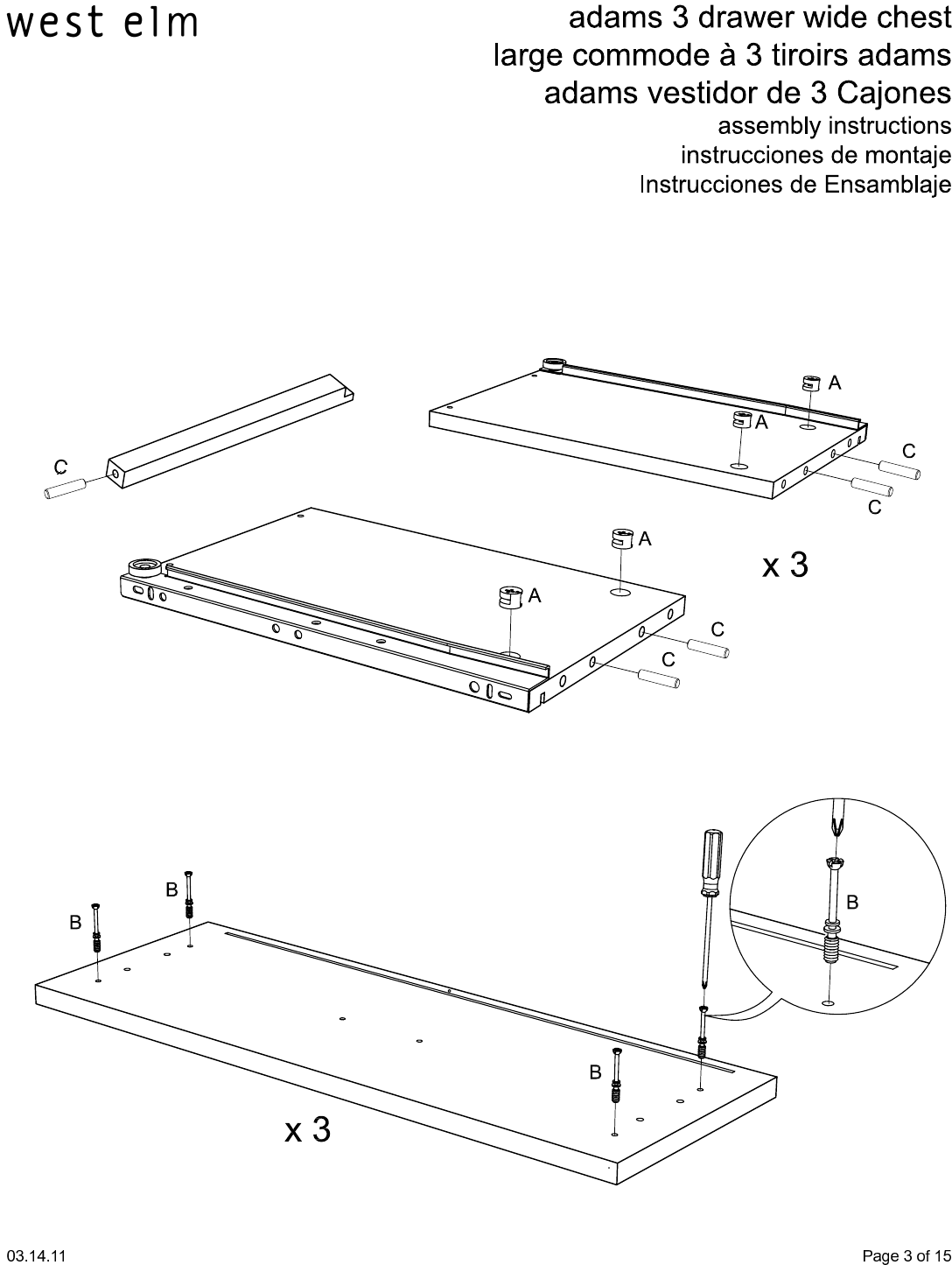 1. Insérez 4 petites serrures à came (A) et 5 petites chevilles (C) dans les panneaux latéraux des tiroirs et dans