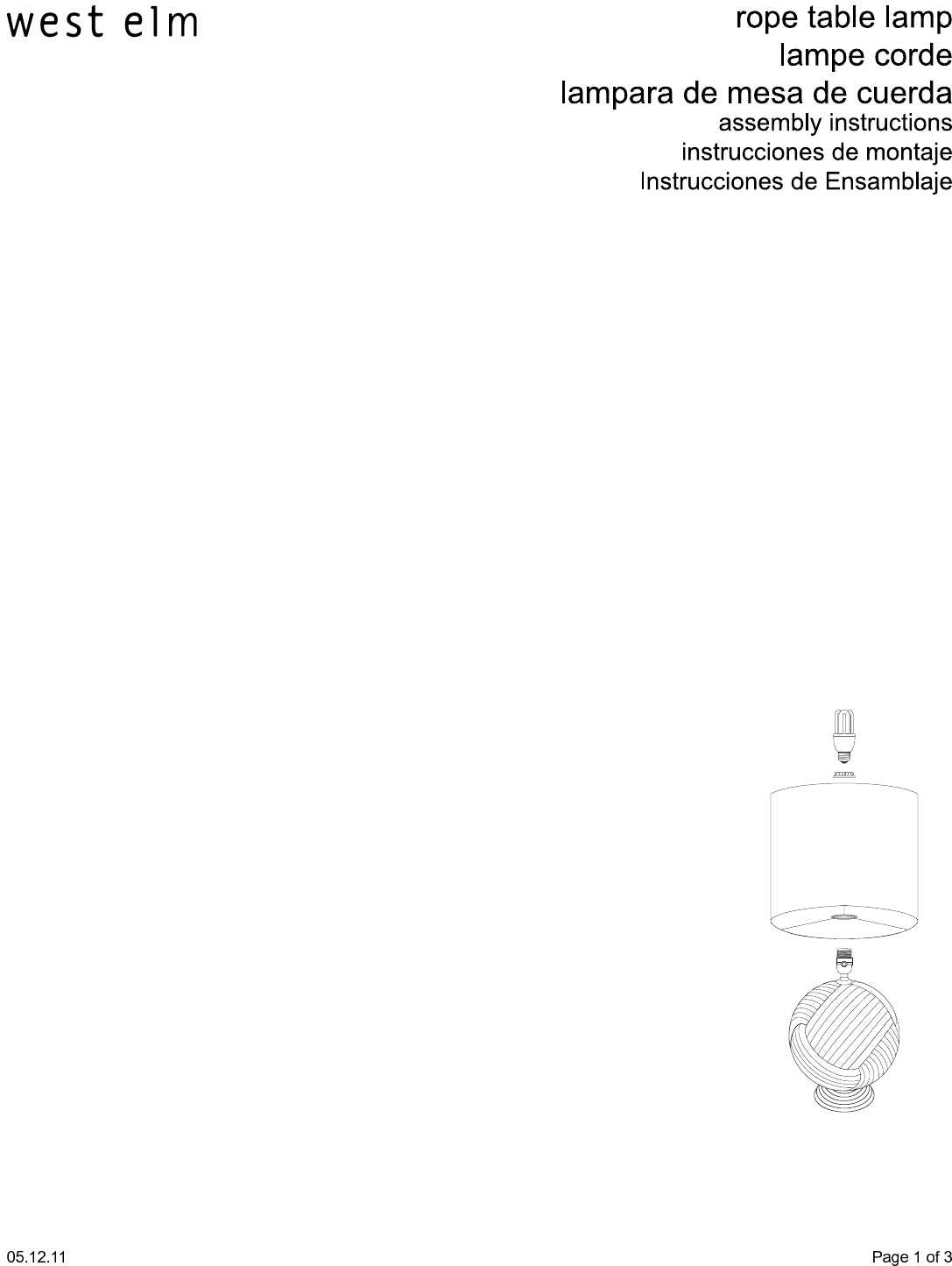 •This xture has been rated for up to (1) This West Elm xture must use a 60 Watt non 3 way light bulb. To