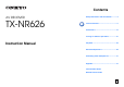 Contents AV RECEIVER TX-NR626 Safety Information and Introduction ............2 Table of Contents ...........................................6 Connections .................................................12 Turning On & Basic Operations..................21 Instruction Manual Playback........................................................29 Advanced Operations ..................................48 Controlling Other Components...................71 Appendix ...........................................