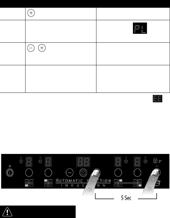 Після ввімкнення варильної поверхні одночасно натисніть кнопку «+» та крайню праву кнопку і утримуйте їх не менше трьох секунд («блокування панелі