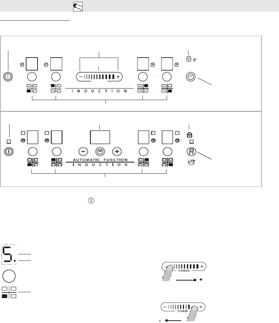 Sæt gryden på kogezonen, tænd for kogesektionen, aktiver den ønskede kogezone ved at trykke på den tilsvarende runde knap. "5" vises på displayet. Anvend skyderen