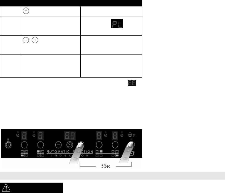 Після ввімкнення варильної поверхні одночасно натисніть кнопку «+» та крайню праву кнопку і утримуйте їх не менше трьох секунд («блокування панелі