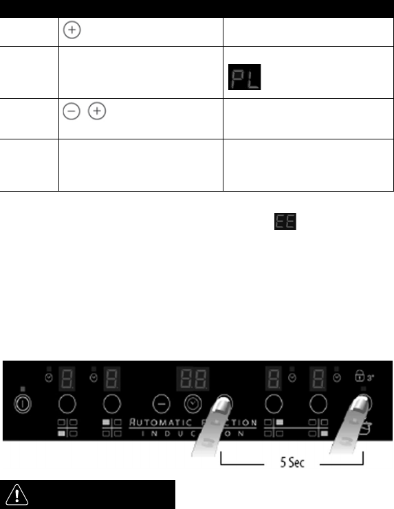Po włączeniu płyty nacisnąć jednocześnie i przytrzymać przez co najmniej trzy sekundy przycisk "+" oraz ostatni przycisk po prawej stronie ("blokada panelu