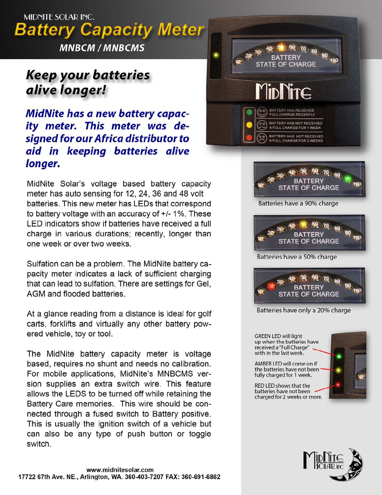 Battery voltage (automatic select) 13v, 24v, 36y, 48y Maximum input voltage (reverse polarity protected} = 70v Switched version when “0ff” Maori 07 watts @ 12v Lira size S fut 10 inches, 22 AWG www.midniteselar.com 17722 $7th Ave. NE., Arlington, WA.