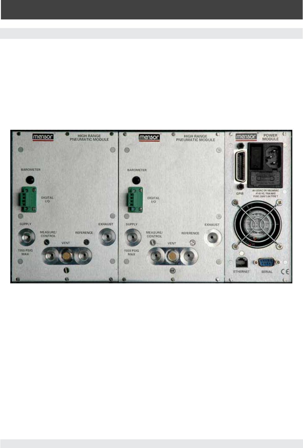 sitioned to the right of the pressure ports are the Ethernet, RS-232 and GPIB connector, the off/on