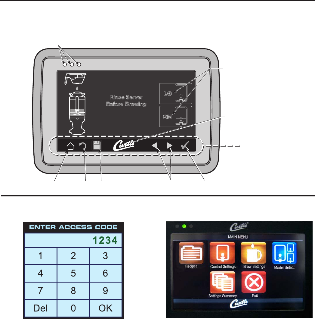 The touch screen turns on when power is available to the controller. The screen will contain standard control feature such as symbols and but-