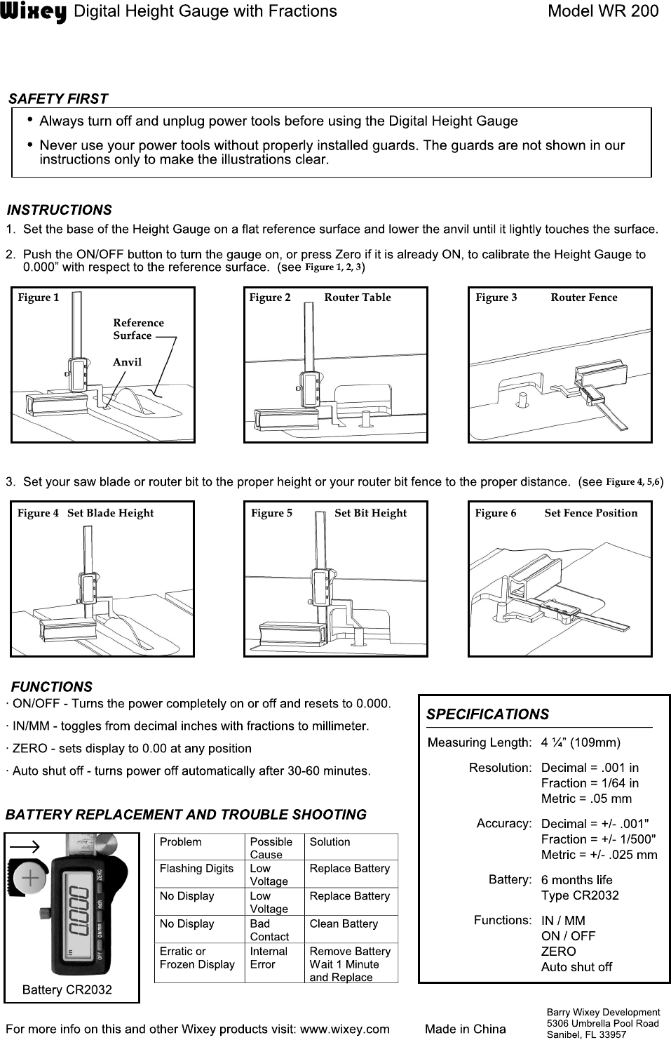 miller Digital Height Gauge with Fractions SAFETY FIRST Model WR 200 * Always tum off and unplug power tools before using the Digital instructions only to make the illustrations clear. * Never use your power tools without properly installed guards. The guards are not shown in our | Height Gauge INSTRUCTIONS 1. Set the base of the Height Gauge on a flat reference surface and lower the anvil until it lightly touches the surface. 2.