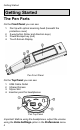 Getting Started Getting Started The Pen Parts On the Front Panel you can see: 1. 2. 3. 4. Pen tip with optical scanning head (beneath the protective cover) 5-way button (Enter and direction keys) Power/Escape key (red) Touch Screen Display Pen Front Panel On the Top Panel you can see: 1. 2. 3. 4. USB Cable Outlet Infrared Screen Stylus Slot Insertion point for headphones Pen Top Panel Important: Before using the headphones, adjust the volume using the Voice Settings option in the Preferences menu.