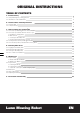 Original instructions TABLE OF CONTENTS 2 1. Product Safety 1.1 Safety Warnings for your lawnmower 1.2 Information on the Landroid®M 3 3 5 2. Technical Data and Component List 2.1 Technical data 2.2 Component list 7 7 8 3. Understanding Your Landroid®M 3.1 How does my Landroid®M know what to mow? 3.2 How does my Landroid®M know where to go? A. Finding the charging base B. Rain sensors C. Sensing the boundary wire D. Starting and stopping while mowing 3.3 How big an area can my Landroid®M mow? 3.