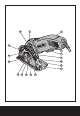 1. Blødt gummi greb 2. Motor Hus 3. Start-stop-kontakt 4. Skala Til Savedybde 5. Håndtag til frigørelse af afskærmning 6. Fingerløftsbøjle 7. Støvslange (Se Fig. Q) 8. Nederste Afskærmning 9. Afskærmning af øvre blad 10. Indikator til måling af udskæring 11. Pakning til bladspænder 12. Spindelskrue 13. Monteringsindstik til parallelt styr 14. Håndtag Til Dybdeindstilling 15. Laserstyr og LED arbejdslys 16. Knap til indstilling af håndtag 17. Kontakt til at tænde/slukke laser og LED 92 18.