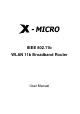 USER’S MANUAL OF X-MICRO WLAN 11b BROADBAND ROUTER Version: 1.2 1 Introduction The X-Micro WLAN 11b Broadband Router is an affordable IEEE 802.11b wireless LAN broadband router solution, setting SOHO and enterprise standard for high performance, secure, manageable and reliable WLAN. This document describes the steps required for the initial IP address assign and other WLAN router configuration. The description includes the implementation of the above steps.
