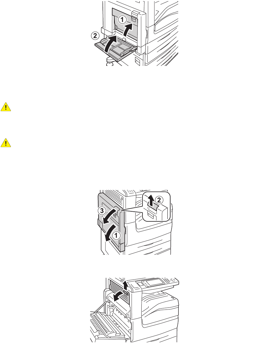 • Der Bereich um die Fixiereinheit kann sehr heiß werden. Verletzungsgefahr!