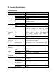 2. Product Specification 2.1 Specification Project Printing Storage Barcode type Detecting Function Parameters Printing method Thermal Transfer/Direct Thermal Resolution 203dpi Max printing width 104mm Printing speed 5inch/s 127mm/s (hoisting speed 150mm realizable 150mm) Interface USB 2.