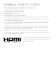 GENERAL SAFETY (CONT.) Please make sure upon positioning this product, the place is: • Not wet or damp and Well ventilated • Away from direct sunlight or heaters. • Away from splashes or food. • Protected from excessive dust or grease. • Do not install this equipment in a confined space such as a bookcase or similar unit. • Do not install the Monitor set near heat sources such as radiators, stoves or other audio visual equipment that produce heat.