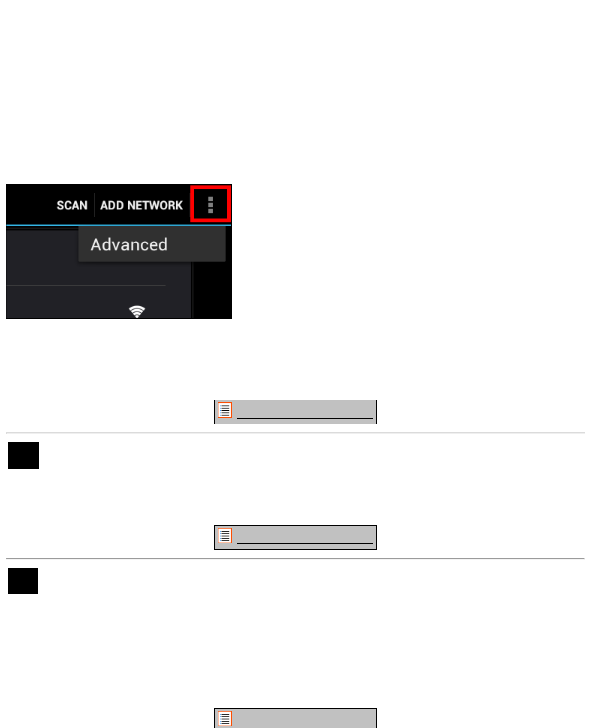 Dans l'écran des paramètres WiFi, cliquez sur le bouton menu situé dans le coin supérieur droit.