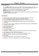 Chapter 1. Overview 1.3 Specifications Video input : One RCA composite, One S-Video. Video system : NTSC, PAL and SECAM multi system support. Audio input : Goes through sound card. Motion capture : MPEG format up to 720x480@NTSC, and 720x576@PAL ; MPEG 4 format @ 320x240; AVI format @ 352x288, 352x240, 320x240 resolution. Still image capture : JPG/BMP/TIF file format. Performance : Up to 25 fps at 720x576 for PAL, 30fps at 720x480 for NTSC. Power Source : 5VDC,350mA(max) through USB port. 1.