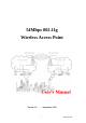 Introduction The next-generation wireless LAN device – 54Mbps 802.11g Wireless Access Point, brings an extremely high performance to the wireless realm. Fully compliant with IEEE802.11g standard, the 54Mbps 802.11g Wireless Access Point also provides powerful features such as the WDS, WPA security, SNMP and more. Maximize network efficiency while minimizing your network investment and maintenance costs. 1.