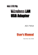 Chapter1 About 802.11g Wireless LAN USB Adapter The IEEE 802.11g Wireless LAN USB Adapter is a standard USB adapter that fits into any standard USB 2.0 and 1.1 slots in a notebook computer. Its 54Mbps data rate gives equivalent Ethernet speed to access corporate network or the Internet in a wireless environment. When installed, IEEE 802.11g Wireless LAN USB Adapter is able to communicate with any 802.11/b and 802.11g compliant products. 1-1 Features and Benefits 1. Fully IEEE 802.11g compatible. 2.