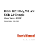 Specification Product Description IEEE 802.11b/g WLAN USB 2.0 Dongle Lead-Free RoHs compliant Host Interface USB 2.0 Operating Voltage DC 5V ± 5% Chipset Mac/BB ZyDAS 1211B Processor RF Chip Airoha AL2330 Power Consumption 11b TX: ≦ 380mA RX: ≦ 200 mA 11g TX: ≦ 380 mA RX: ≦ 200 mA Radio Antenna PCB Antenna Antenna Gain 1.64 dBi(Peak) Output Power IEEE 802.11b: + 2.5dB 19.18dBm @ 1/2/5.5/11Mbps IEEE 802.11g: + 2.5dB 22.36dBm @ 54Mbps 22.36dBm @ 48 Mbps 22.36dBm @24/36Mbps 22.36dBm @6/9/12/18Mbps IEEE 802.