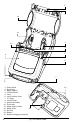• A steadily lit yellow LED indicates an error condition. This can be caused by one of the following: 1. The media cover is not completely closed and latched. 2. The printer is out of media. Green LED Steady Light indicates power on and/or established RF link. Fast Blink indicates no RF link (on RF equipped units only) Slow Blink means low battery Power Button Press to turn unit on. Press again to turn unit off Yellow LED Steady Light indicates error condition: out of media or media cover not closed.