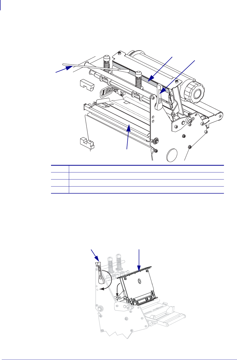 6. Push down the printhead assembly (1), and then rotate the printhead-open lever (2)