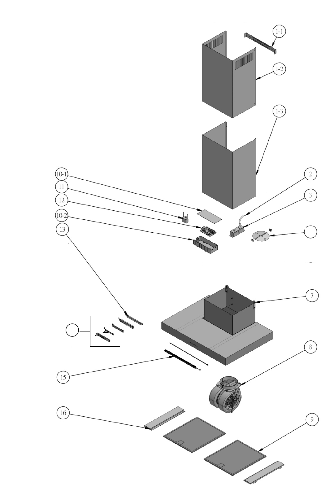 Roma ZRO-E30DS, ZRO-M90DS Ref # Part # Description 1-1 54110062 Bracket, Duct Cover 1 1-2 50050085 Duct Cover, Upper 1 1-3 50050086 Duct Cover, Lower 1 2 11030028 Wires, Electrical 1 3 56200080 Electrical Junction Box 1 4 54060007 Damper, 6" Round 1 7 54140094 Bracket, Mounting 2 8 12120066 Motor 1 9 50200053 Aluminum Mesh Filter 2 10 50500160 Component Box Assembly 1 10-1 56210071 Component Box Cover 1 10-2 56200051 Component Box 1 11 12050021 Capacitor