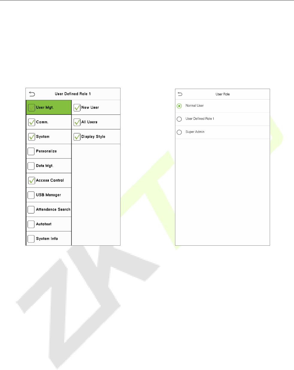 Note: If the User Role is enabled for the Device, tap on User Mgt. > New User > User Role to assign the