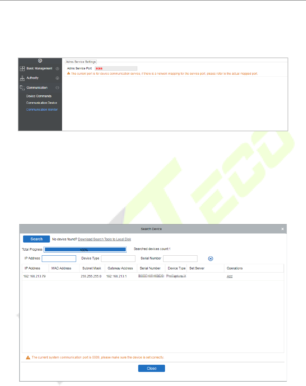 Login to ZKBioAccess software, click System > Communication > Communication Monitor to set the