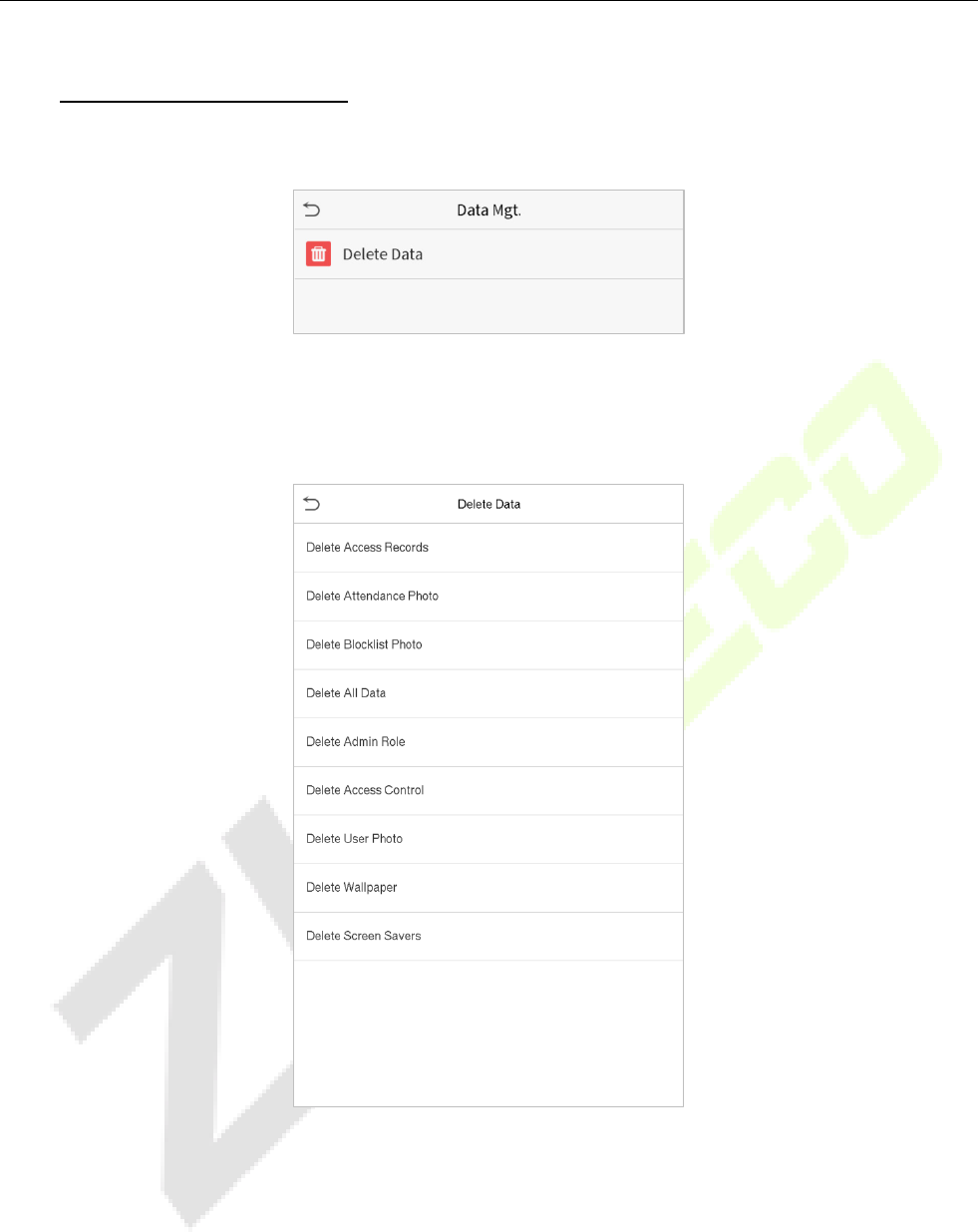 On the Main Menu, tap Data Mgt. to delete the relevant data in the device.