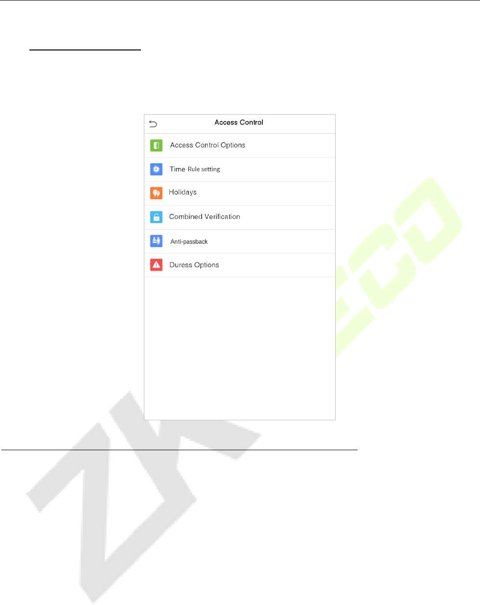 On the Main Menu, tap Access Control to set the schedule of door opening, locks control and to configure