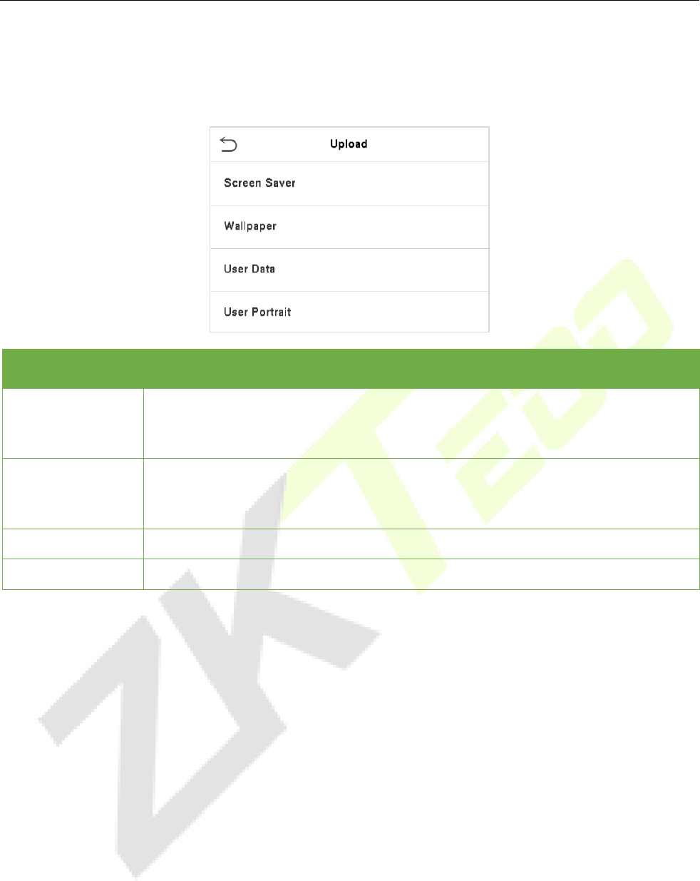 To upload all screen savers from USB disk into the device. You can choose Upload