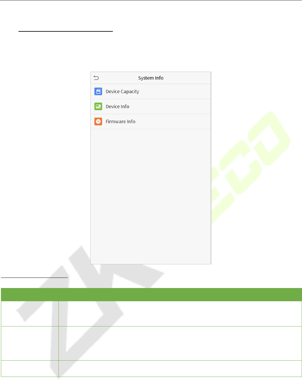 On the Main Menu, tap System Info to view the storage status, the version information of the device, and