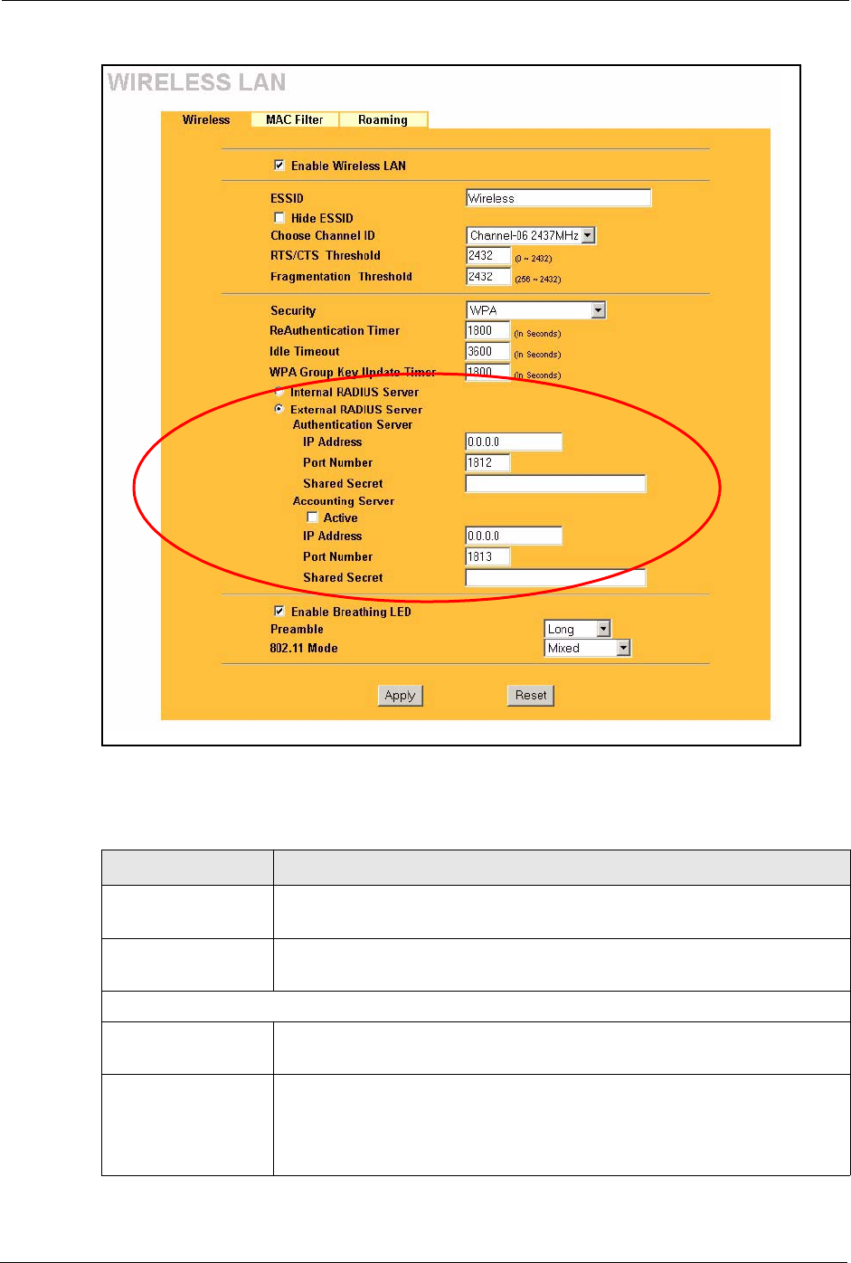 Select this radio button to use the ZyAIR’s Internal RADIUS Server. You can