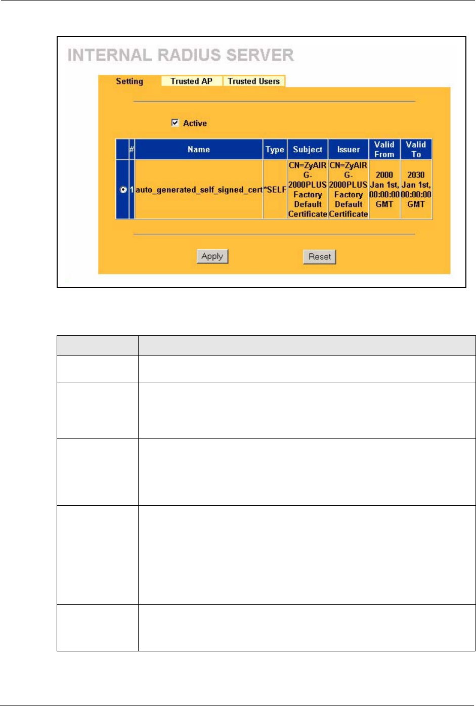 Active Select the Active checkbox to have the ZyAIR use its internal RADIUS server to
