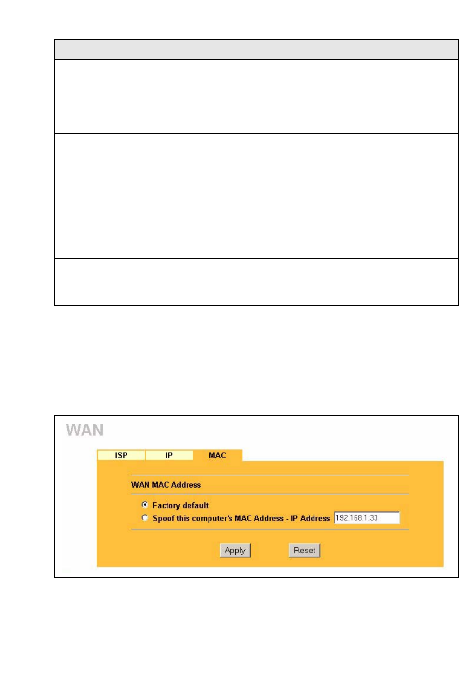 To change your ZyAIR’s WAN MAC settings, click WA N, then the WA N M A C tab. The