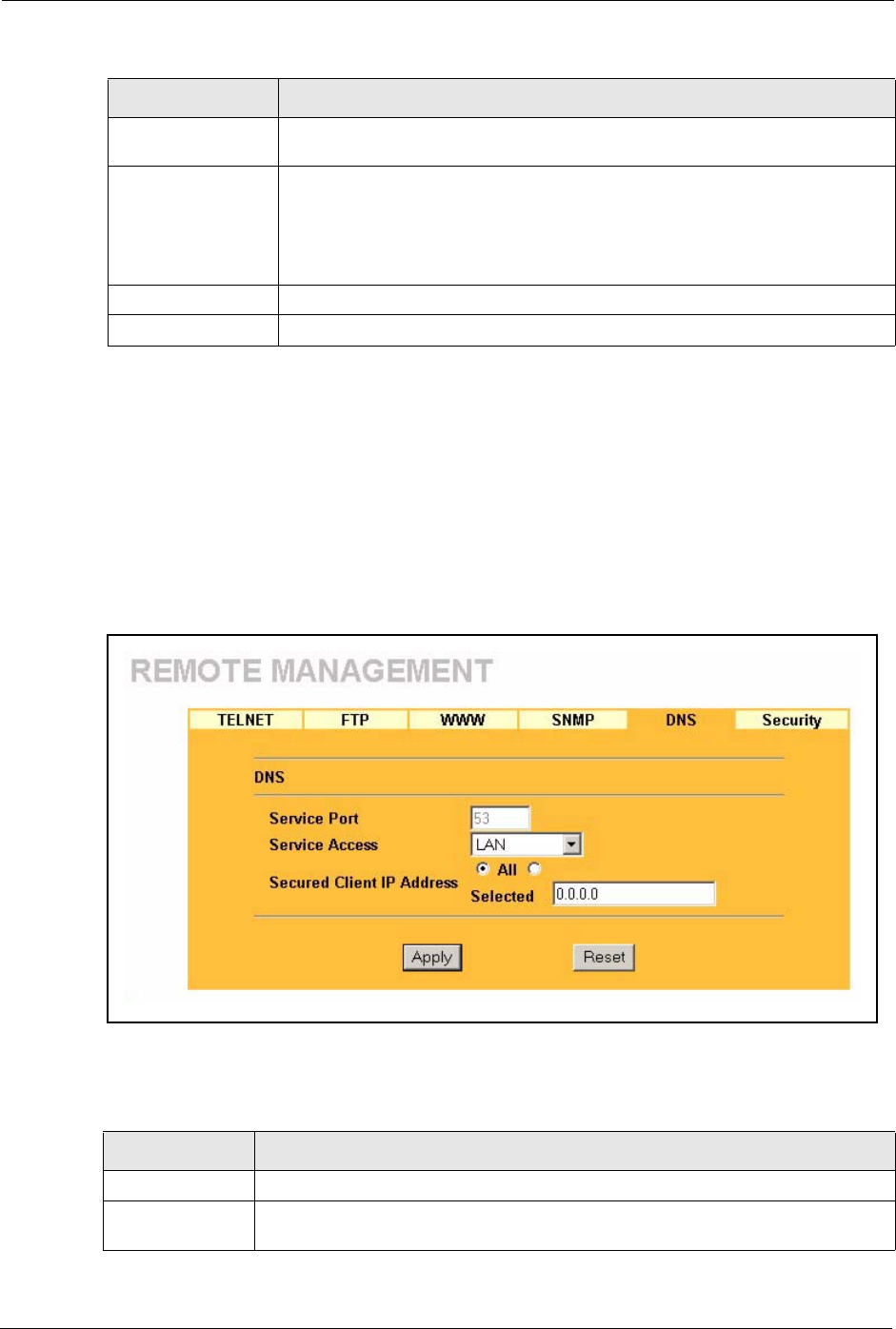 To change your ZyAIR’s DNS settings, click REMOTE MGMT, then the DNS tab. The