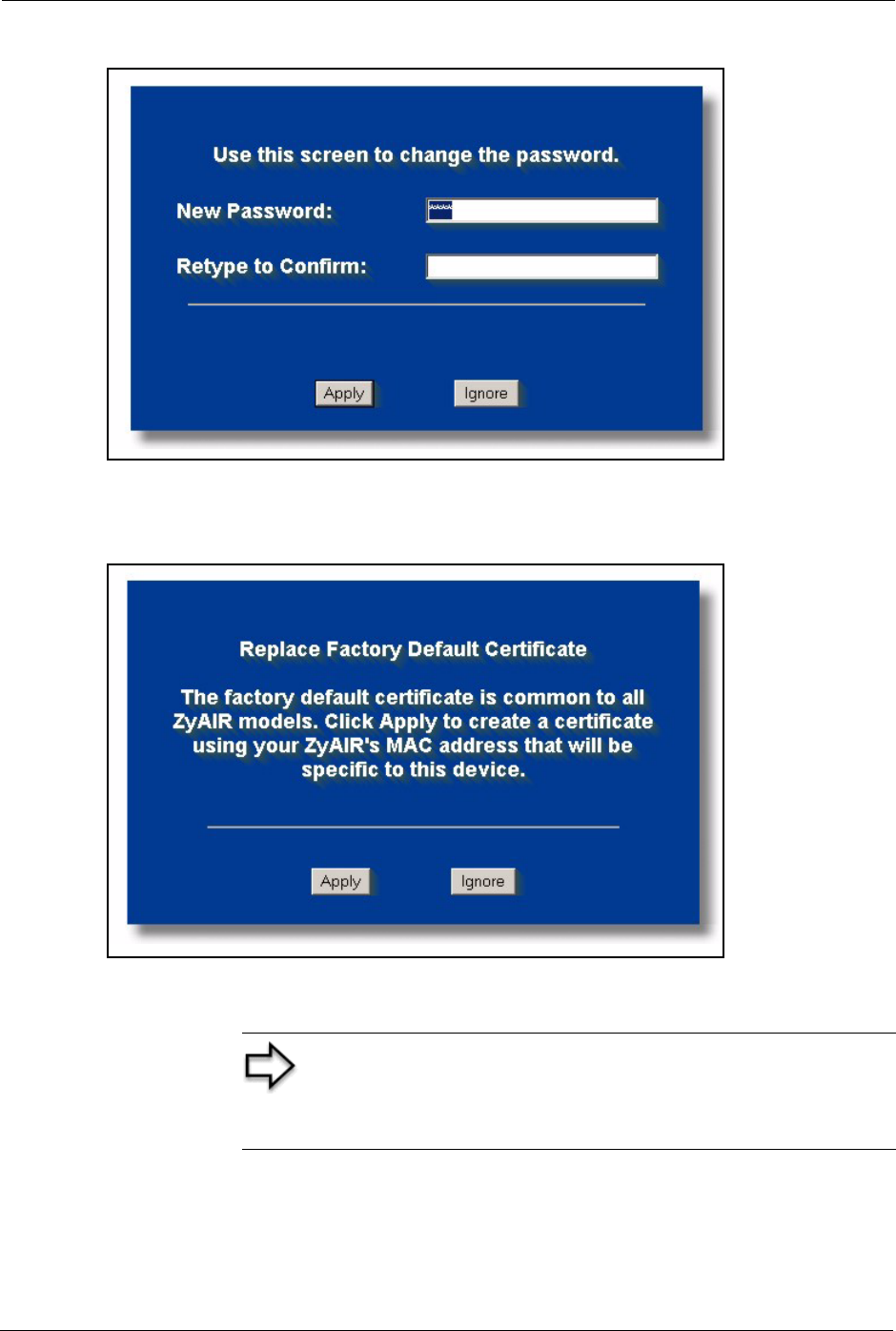 6 Click Apply in the Replace Certificate screen to create a certificate using your ZyAIR’s