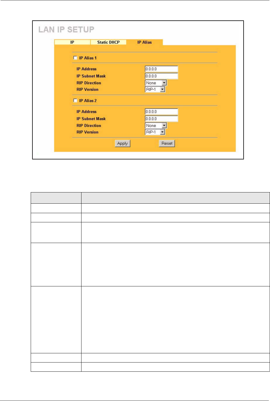 IP Alias 1,2 Select the check box to configure another LAN network for the ZyAIR.