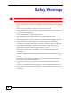 Safety Warnings Safety Warnings 1 For your safety, be sure to read and follow all warning notices and instructions. • Do NOT use this product near water, for example, in a wet basement or near a swimming pool. • Do NOT expose your device to dampness, dust or corrosive liquids. • Do NOT store things on the device. • Do NOT install, use, or service this device during a thunderstorm. There is a remote risk of electric shock from lightning. • Connect ONLY suitable accessories to the device.