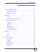Contents Overview Contents Overview Introduction, Wizards and Tutorials ..................................................................................... 37 Getting To Know Your ZyXEL Device ........................................................................................ 39 Introducing the Web Configurator .............................................................................................. 43 Wizards .....................................................................................