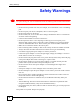 Safety Warnings Safety Warnings 1 For your safety, be sure to read and follow all warning notices and instructions. • Do NOT use this product near water, for example, in a wet basement or near a swimming pool. • Do NOT expose your device to dampness, dust or corrosive liquids. • Do NOT store things on the device. • Do NOT install, use, or service this device during a thunderstorm. There is a remote risk of electric shock from lightning. • Connect ONLY suitable accessories to the device.