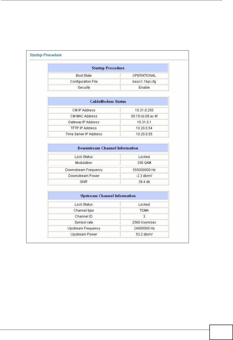 3.4.2 Viewing the Cable Modem Status Screen