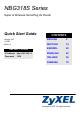 NBG318S Series Super G Wireless HomePlug AV Router Quick Start Guide CONTENTS ENGLISH 2 DEUTSCH 14 ESPAÑOL 28 IP Address http://192.168.1.1 FRANÇAIS 42 Password ITALIANO 56 SVENSKA 70 Version 3.60 11/2007 Edition 2 DEFAULT LOGIN 1234 Copyright © 2007. All rights reserved.