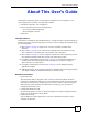 About This User's Guide About This User's Guide This manual is designed to guide you through the configuration of your ZyWALL for its various applications. Generally, it is organized as follows.