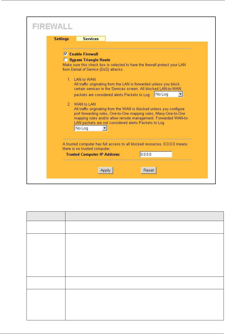 Enable Firewall Select this check box to activate the firewall. The Prestige performs access control