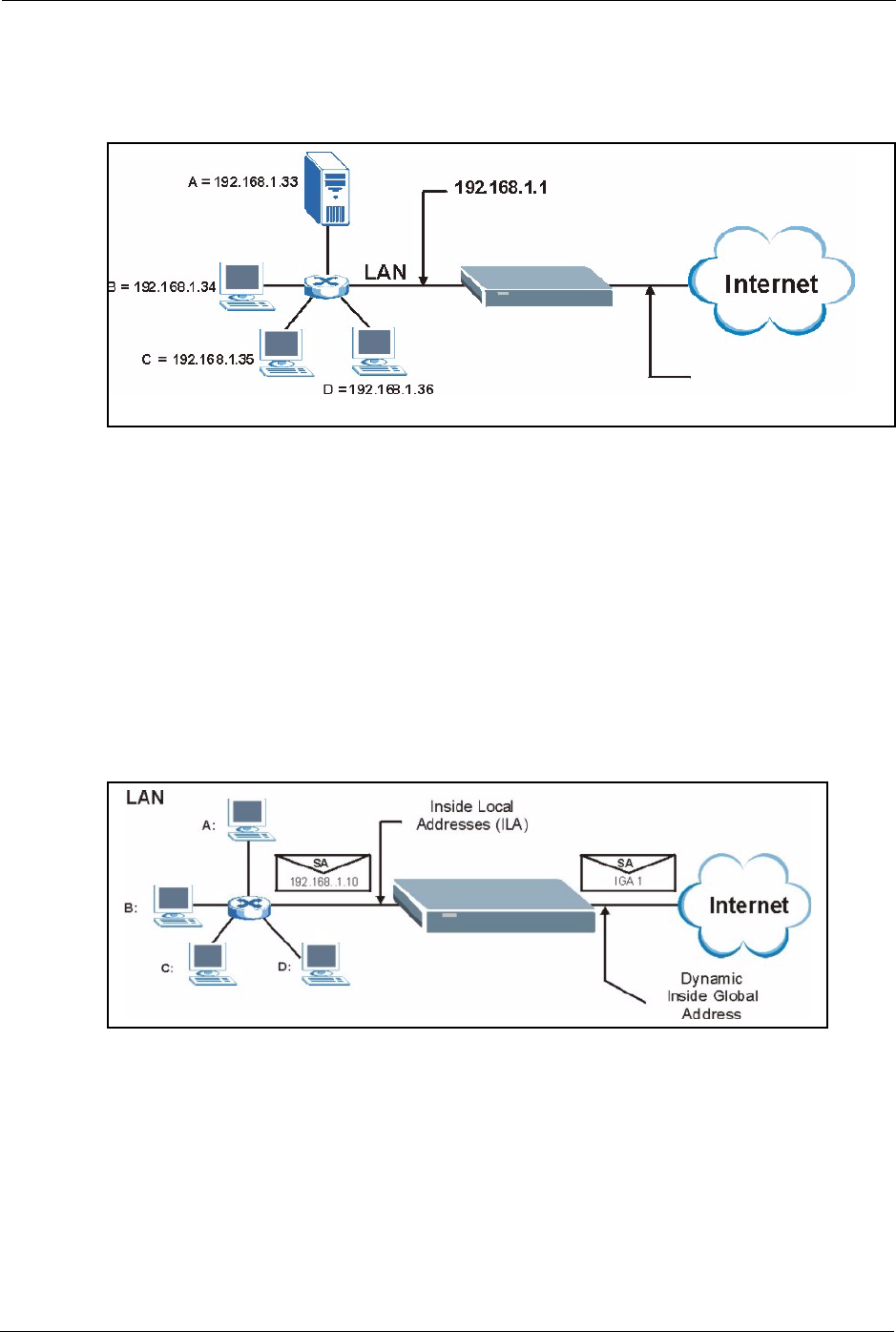 In the following Internet access example, you only need one rule where the ILAs (Inside Local
