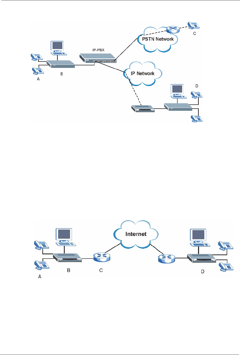 The Prestige then sends your call through your modem or router (C) and the Internet to the